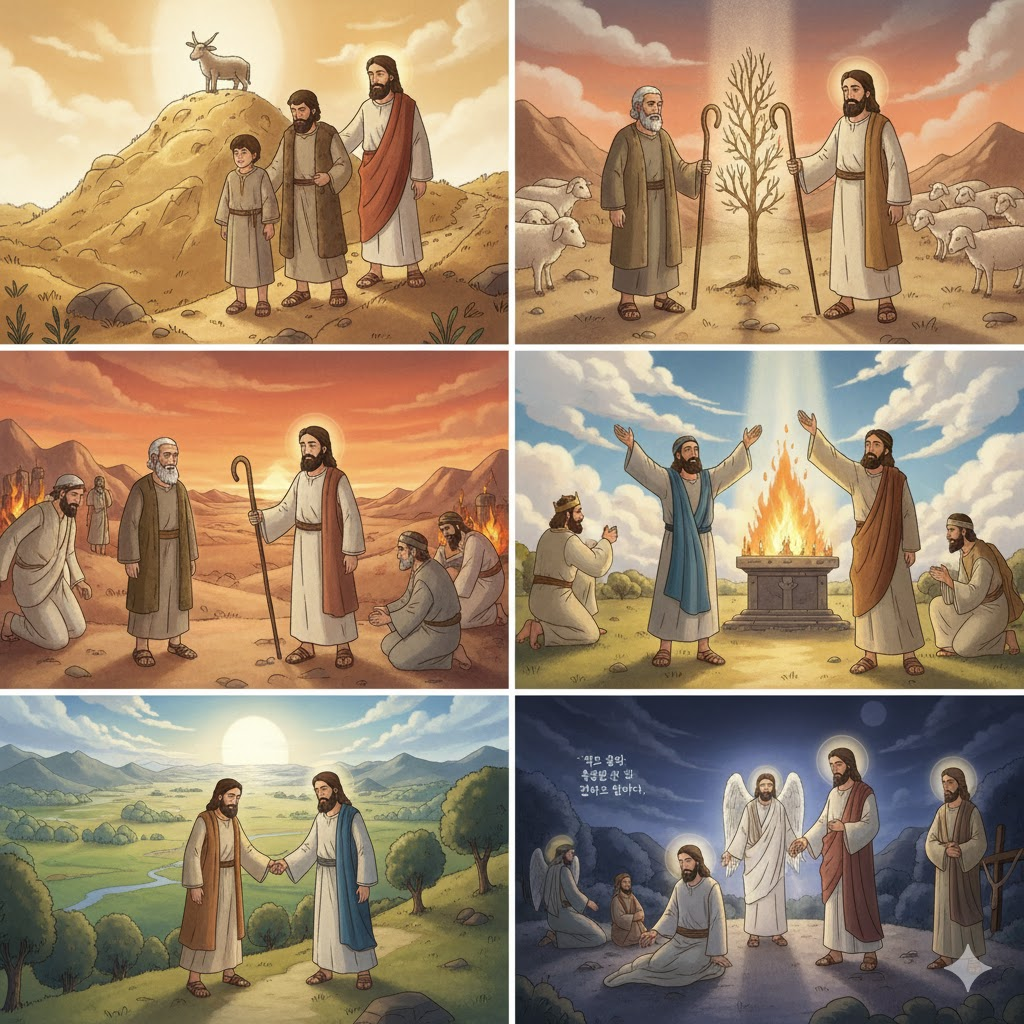마침내 아들을 제단에 묶고, 이삭도 모든 것을 포기한 듯 눈을 감았을 때, 아브라함이 칼을 높이 들었습니다. 바로 그 순간, 오히려 놀라신 하나님께서 다급하게 아브라함을 막으셨습니다. "아브라함아, 아브라함아!" 그리고 하나님이 미리 준비하신 숫양을 발견했을 때, 아브라함과 이삭은 그의 평생에 가장 기쁘고 감사한 제사를 드렸습니다.