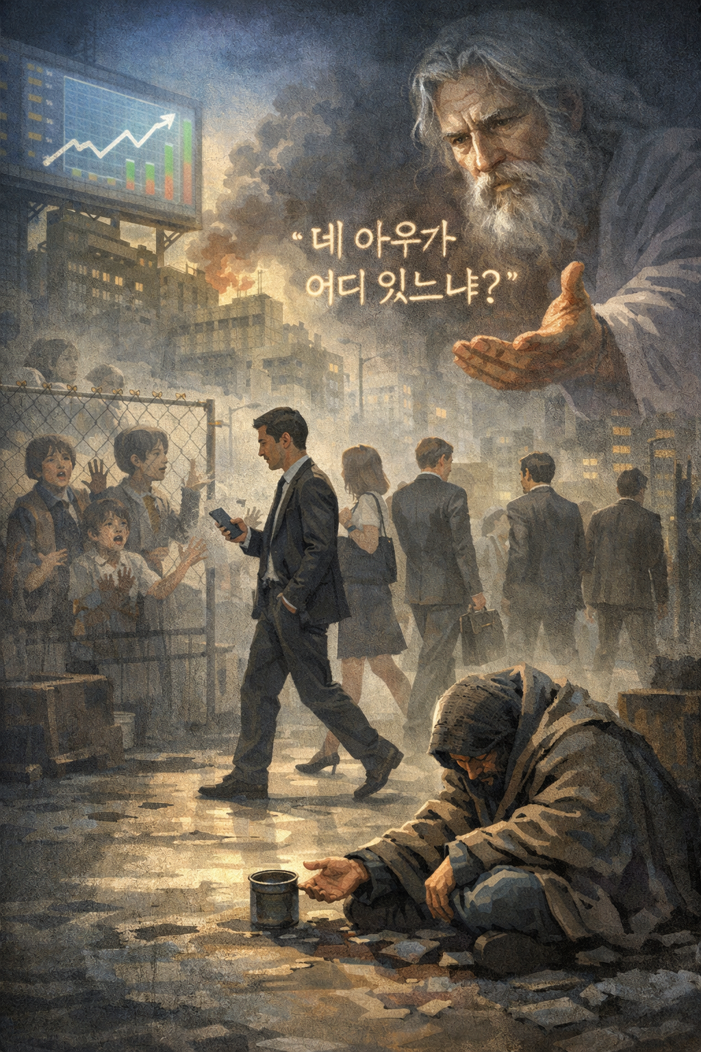 거리의 노숙자를 보지만 시선을 돌리고, 불공정한 구조를 알지만 침묵하며, 고통받는 이웃의 삶을 “어쩔 수 없는 현실”로 정리합니다.