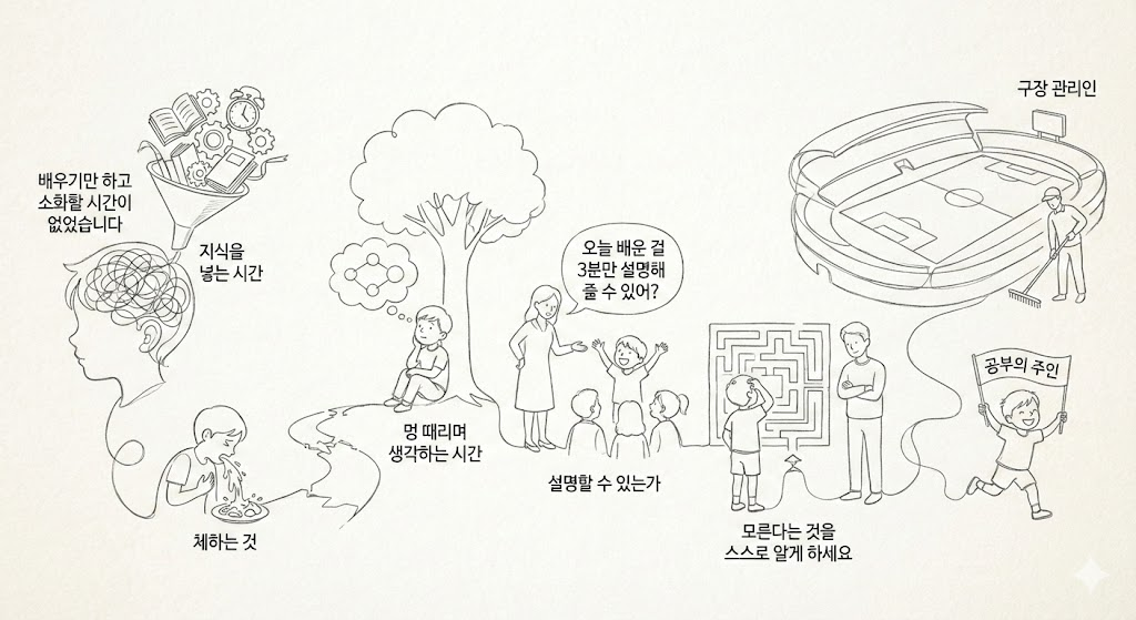 "오늘 문제집 몇 장 풀었니?"라는 질문은 아이를 '빨리 끝내는 기계'로 만듭니다. 대신 "오늘 배운 걸 엄마(아빠)한테 3분만 설명해 줄 수 있어?"라고 물어보고 대답하는 것에 익숙하게 해주었어야 한다고 생각합니다. 어머니가 피하셔도, 아버지가 묻지 않으셔도 즐겁게 내가 알고 깨달은 것을 퍼뜨리고 다니던 내 스타일과 아들들은 크게 달랐던 것을 그대로 방치한 것을 후회합니다. 스스로 설명할 수 없다면 그건 공부한 게 아니라 그냥 구경한 것에 불과한 것 같습니다.
