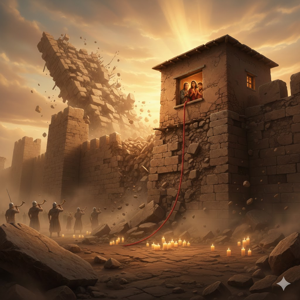 이렇게 라합 → 보아스 → 오벳 → 이새 → 다윗 왕 → … → 예수 그리스도로 라합이 매단 그 붉은 줄은 결국 다윗의 자손, 예수 그리스도의 탄생으로 이어지는 ‘생명의 족보’가 되었습니다. 그녀가 창문에 매단 것은 일시적인 피난처가 아니라, 인류를 구원할 메시아의 길을 예비한 거룩한 헌신이었습니다.