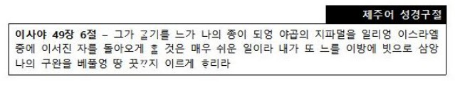 우리 교회는 매주 설교 본문의 핵심 구절은 '제주어'로 번역해서 주보에 싣는다.(예를 들어 지난 주 성안교회 설교본문 이사야 49:6 그가 이르시되 네가 나의 종이 되어 야곱의 지파들을 일으키며 이스라엘 중에 보전된 자를 돌아오게 할 것은 매우 쉬운 일이라 내가 또 너를 이방의 빛으로 삼아 나의 구원을 베풀어서 땅 끝까지 이르게 하리라. 제주어 성경구절: 그가 갈기를 나의 종이 되엉 야곱의 지파덜을 일리엉 이스라엘 중에 이서진 자를 돌아오게 할 것은 매우 쉬운 일이라 내가 또 느를 이방에 빗으로 삼앙 나의 구완을 베풀엉 땅 끗까지 이르게 하리라 (주보와는 달리 여기서는 아래 아를 '아'로 표기함))