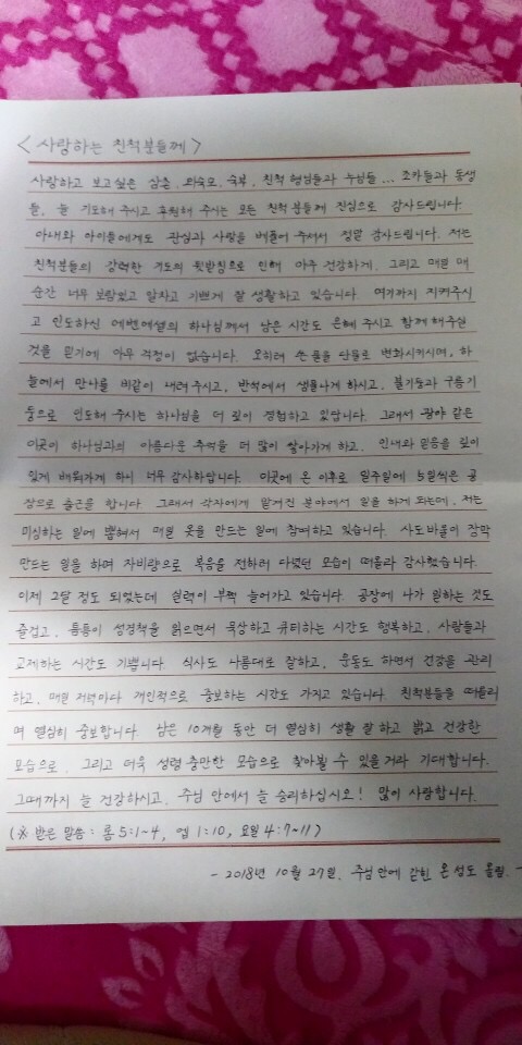 그러나 우리 안에 보배되신 예수님이 계신 것도 다시 분명하게 알게 되었다. 내가 낙심하고 끝이라고 생각할 때 하나님께서 그때부터 일하기 시작했다. 내 마음에 하나님께서 크신 위로를 부어주셨다. 밤에도 악몽이 아니라 소망의 꿈을 꾸고 감옥을 철장이 아니라 예수님을 주목하여 바라보게 이끌어 주셨다. 이 사랑을 너무 크게 부어주셨다. 내가 당하는 고난보다 훨씬 큰 위로를 부어주셨다. 고전 1:3~5에서 바울은 '찬송하리로다'하며 외쳤다. 하나님께서 '넘치도록' 은혜를 부어주셨기 때문이다. 주님이면 충분했다.