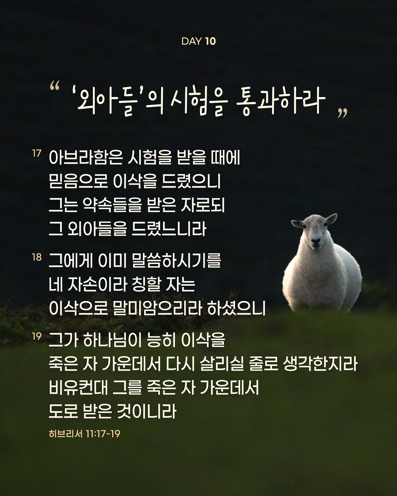 하나님 말씀이 이해되지 않고, 심지어 가당치 않아 보이는가? 죽을 것 같은 결과가 예상되더라도 하나님 말씀에 순종하면, 비록 죽더라도 하나님께서 우리를 부활시켜 주실 것이다. 나를 위해 외아들 예수를 내놓으신 하나님을 바라보며, 지금까지 우리가 줄곧 실패했던 시험을 넉넉히 이기자. 우리의 외아들을 내려놓자.