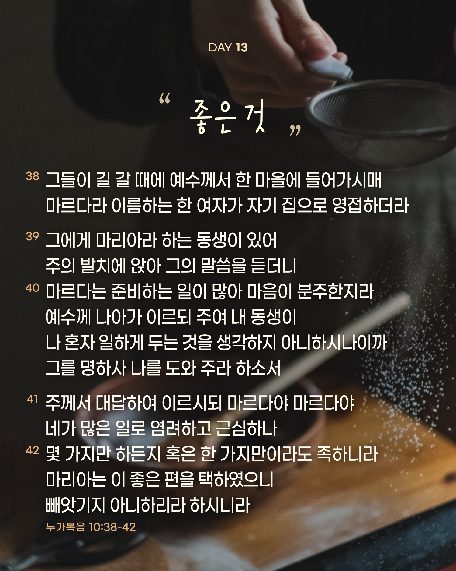음식을 준비해야 하던 마르다는 마음이 급해졌다. 마리아를 찾았다. 그런데, 마리아는 예수님 앞에서 말씀을 듣고 있었다. 어서 나와서 함께 일을 하자는 마르다의 신호를 마리아는 외면한다. 마르다는 마리아에게도, 예수님에게도 섭섭해서 예수님께 일러바친다. 우리가 아는 예수님이라면 마리아를 나무라셨을 것 같다. 그러나 언니를 돕도록 하는 것이 좋은 일이었을 텐데, 예수님은 오히려 마리아를 나무라신다. 마르다에게는 여러 가지 하지 말고 한 가지면 된다라고 나무라시며, 마리아는 좋은 것을 택했으니 빼앗기지 않을 것이라고 말씀하신다. 마르다에게 하신 그 말씀이 음식 가짓수에 대한 것이었을까?