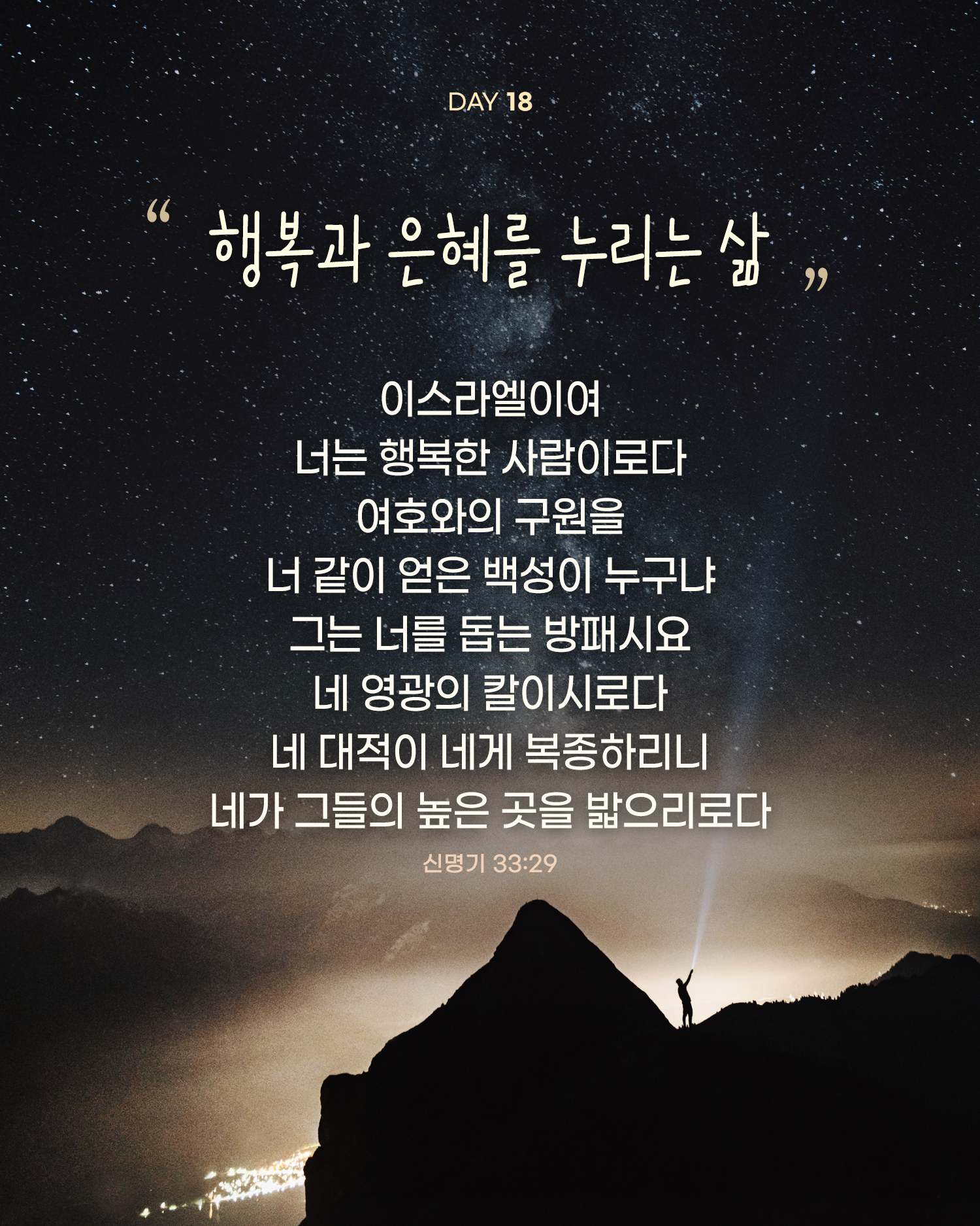 둘째. 행복은 소유의 넉넉함이 아니라, ‘구원’이 하나님께서 말씀하시는 행복의 기준이다. 여전히 광야에 있고, 가나안에서도 영적 전쟁을 치러야 했지만 그들은 구원받은 백성이었기에 이미 행복했다. 어떤 상황이나 역경 속에서도 그것이 당연한 것이 아니라 하나님이 은혜이며 하나님의 섭리임을 깨닫고 나아가자.