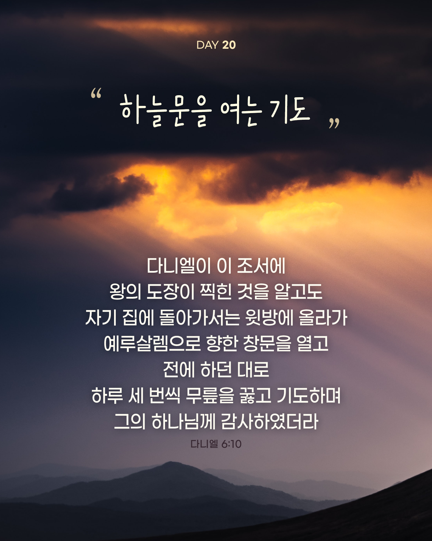 (단 6:10 다니엘이 이 조서에 왕의 도장이 찍힌 것을 알고도 자기 집에 돌아가서는 윗방에 올라가 예루살렘으로 향한 창문을 열고 전에 하던 대로 하루 세 번씩 무릎을 꿇고 기도하며 그의 하나님께 감사하였더라)